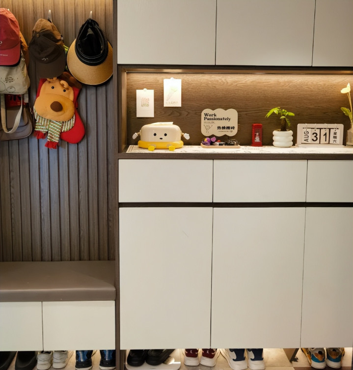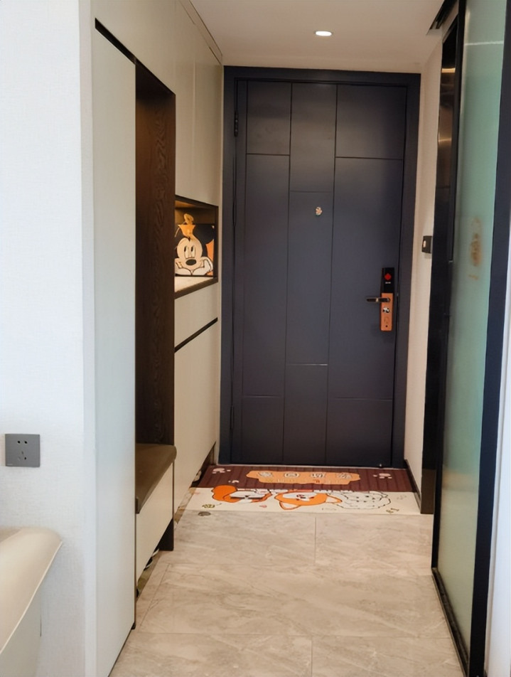 有很多的户型,它的门口是自带玄关位置的,我们可以利用这个空隙装上一个嵌入式玄关柜,