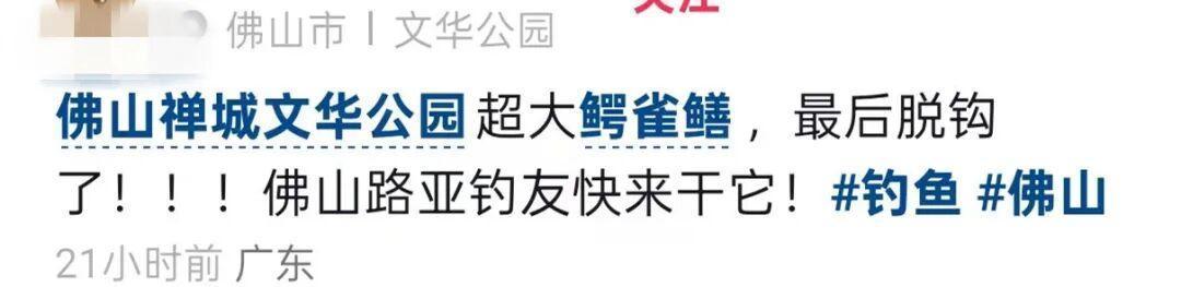3月24日有网友爆料,在广东佛山文华公园发现外来物种鳄雀鳝,视频发布者称曾尝试捕捞但最后脱钩,评论区视频发布者给出具体位置:“文华公园那个湖,在水舞声光秀这边”。画面显示,这条鱼身上疑似携带鱼钩,有网友建议报警处理。